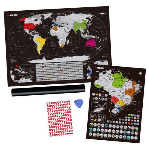 Megacombo Mapa Raspadinha - Mapa Mundi Raspar + Mapa Brasil + Maravilhas da Arquitetura + Adesivos Pins