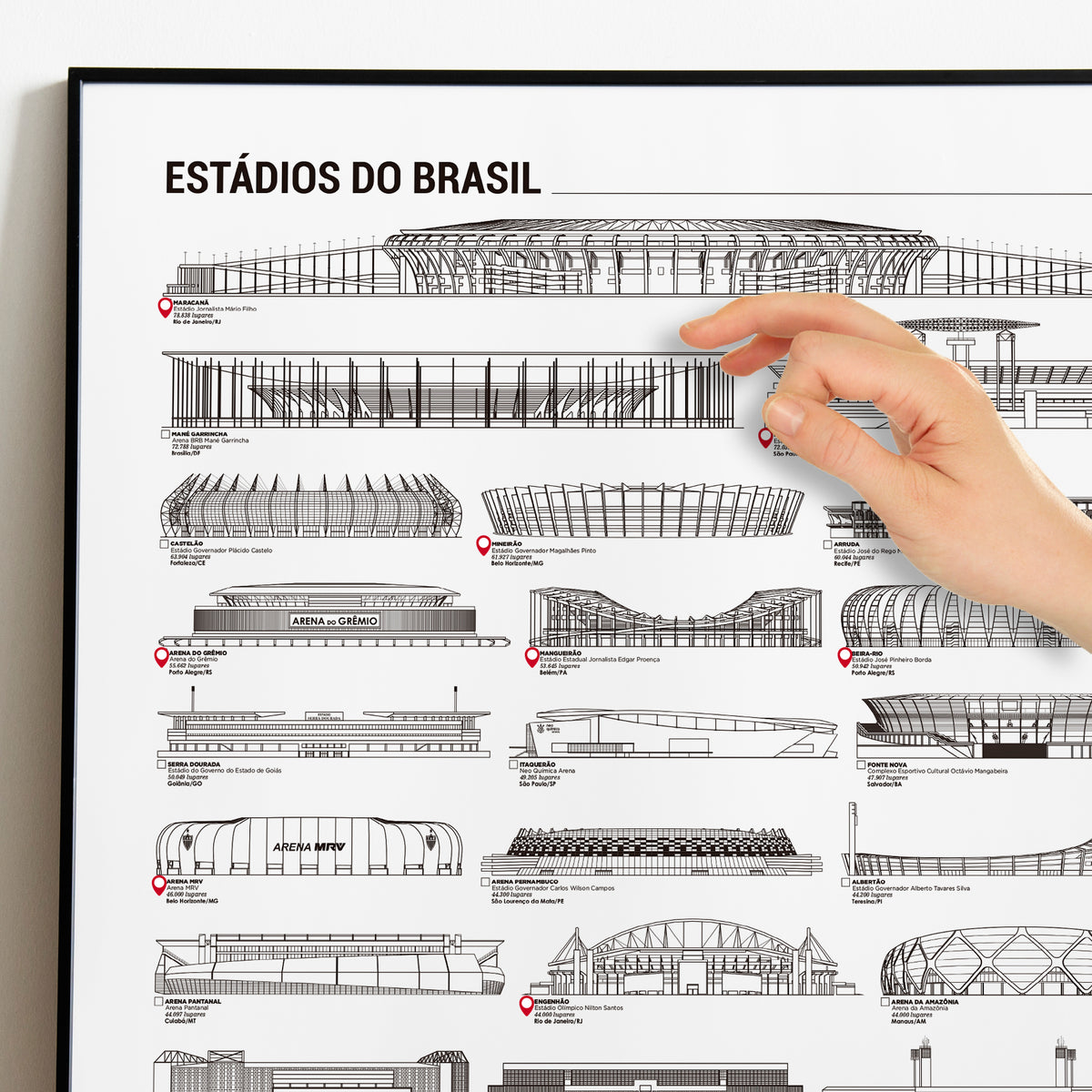 Arte com os estádios brasileiros organizados por ordem de capacidade, inclui legenda com apelido e nome oficial do estádio e também o seu número de assentos. Também inclui cartela de adesivos de pins para marcar os estádios que já visitou.