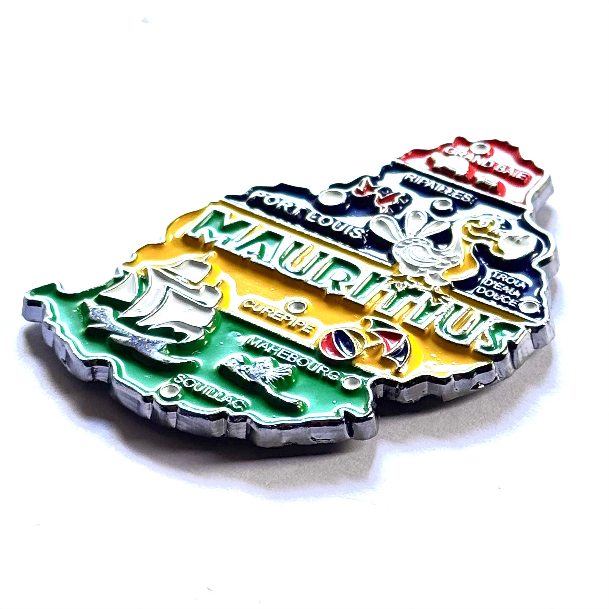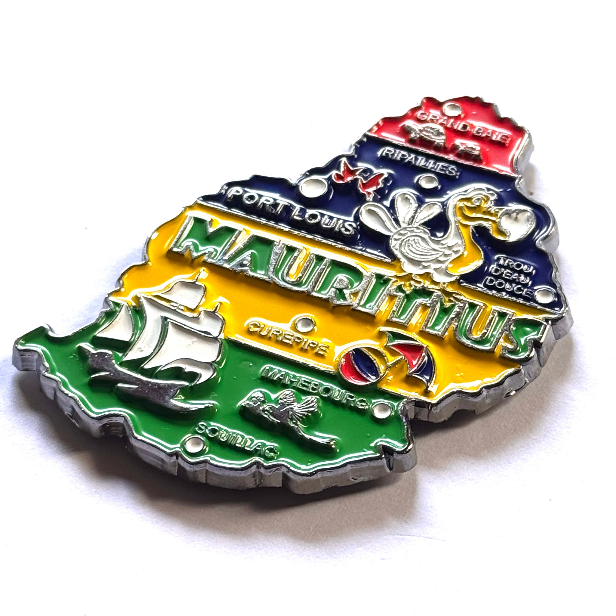 Imã de geladeira das Ilhas Maurício em metal com mapa, bandeira, cidades e símbolos.