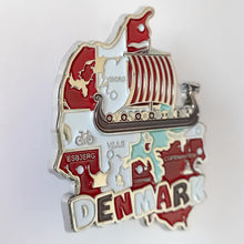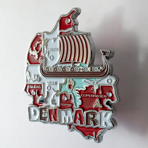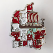 Imã de geladeira da Dinamarca em metal com mapa, bandeira, cidades e símbolos.