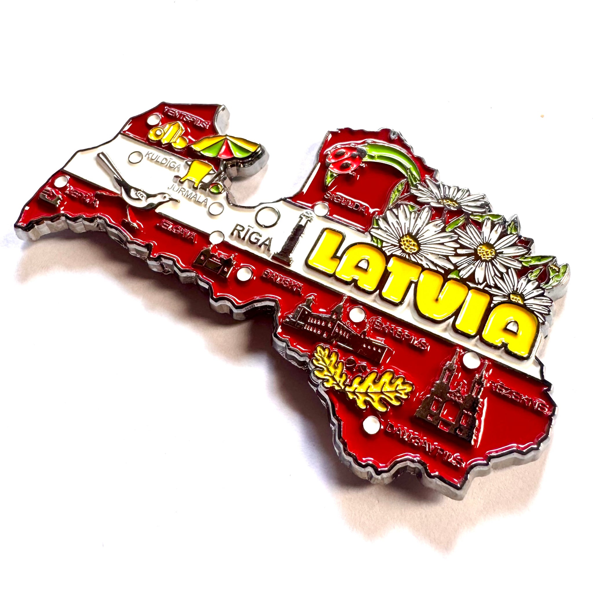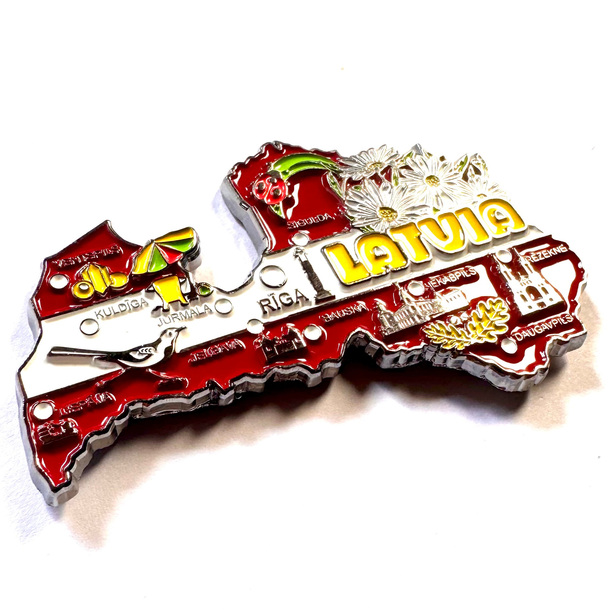 Imã de geladeira da Letônia em metal com mapa, bandeira, cidades e símbolos.