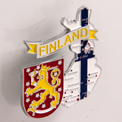 Imã de geladeira da Finlândia em metal com mapa, bandeira, cidades e símbolos.