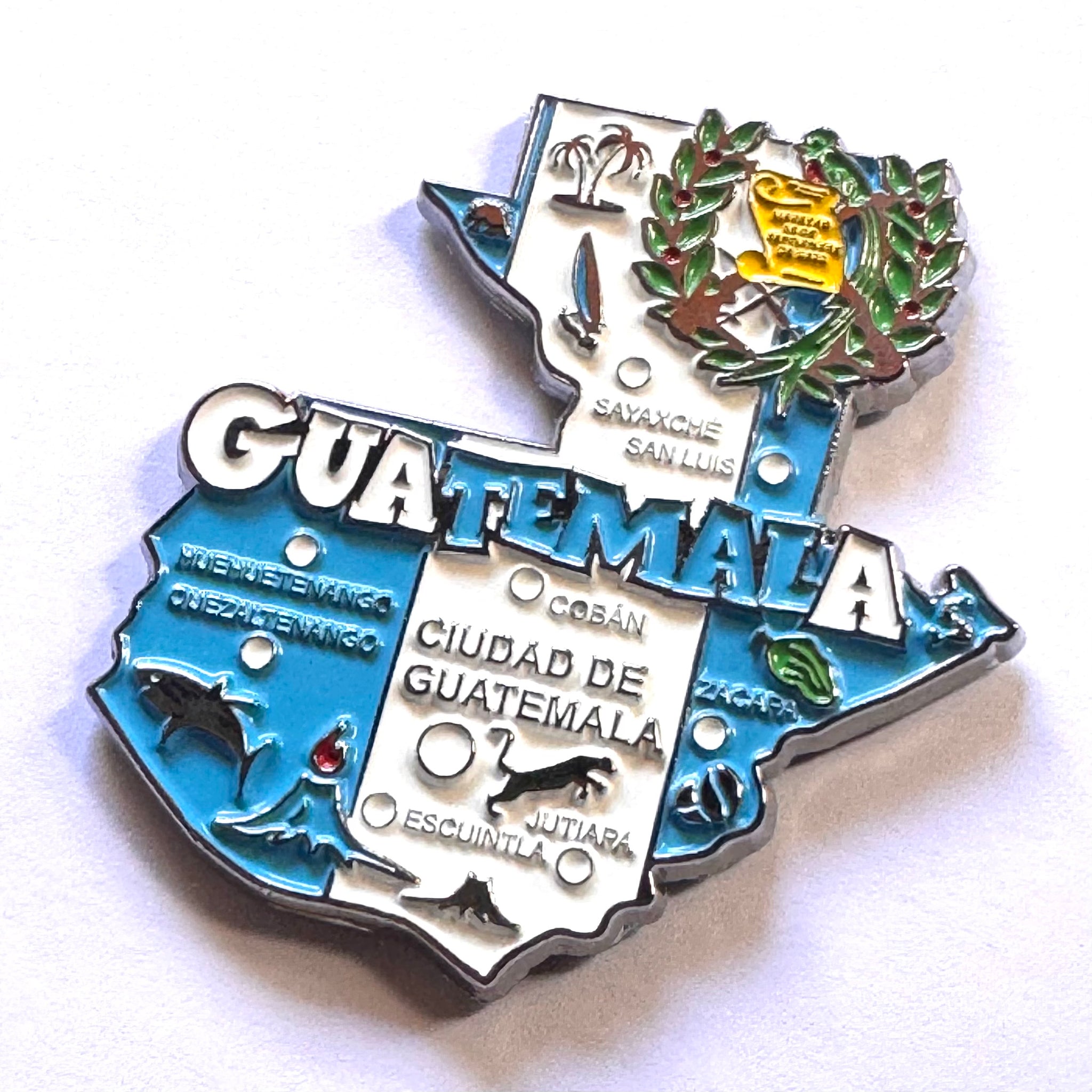 Imã de geladeira da Guatemala em metal com mapa, bandeira, cidades e símbolos.